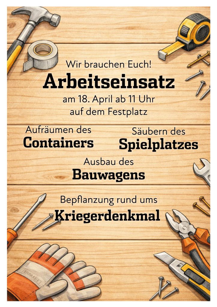 Am Samstag, 18.04.2026 treffen wir uns um 11:00 Uhr zum Arbeitseinsatz auf dem Festplatz.