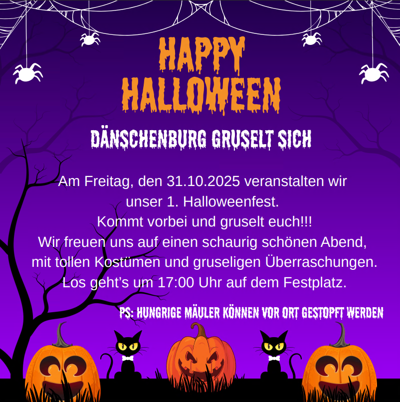Am 31.10.2025 findet ab 17:00 Uhr auf dem Festplatz unser 1. Halloweenfest statt.