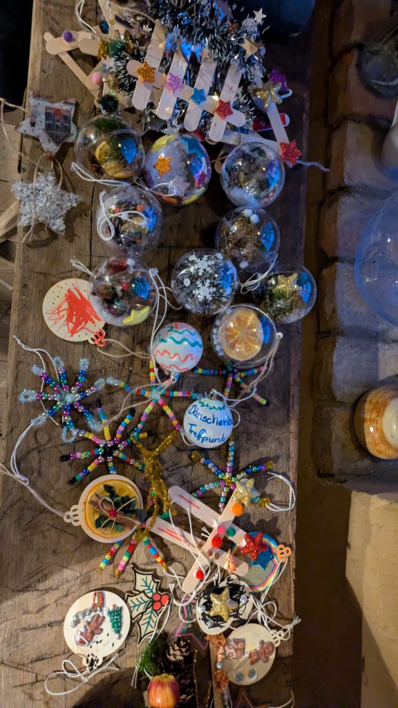 Um 15:00 Uhr trafen sich Kinder und Erwachsene in der Peterschen Scheune – an dieser Stelle ein herzliches Dankeschön an Familie Peters für die Bereitstellung der Räumlichkeiten und Vorbereitung. Dort wurde mit viel Freude, Kreativität und etwas Glitzer fleißig gebastelt. Aus Holzsternen und -bäumen, bunt gedrehten Pfeifenputzersternen, gefüllten und bemalten Weihnachtskugeln sowie selbst bemalten Ornamenten entstanden liebevolle Kunstwerke. Jedes Stück ist ein Unikat und mit viel Freude gefertigt.