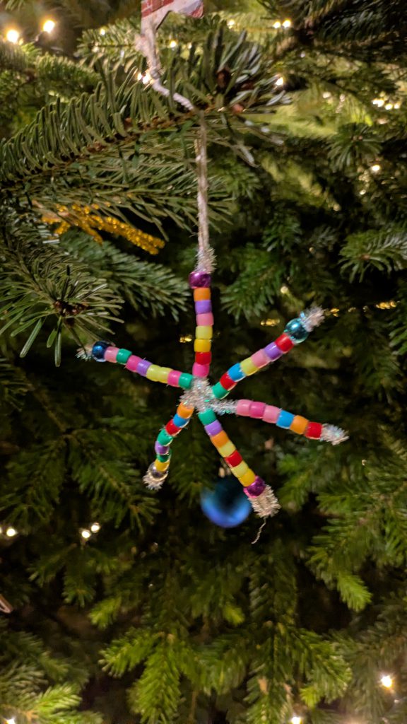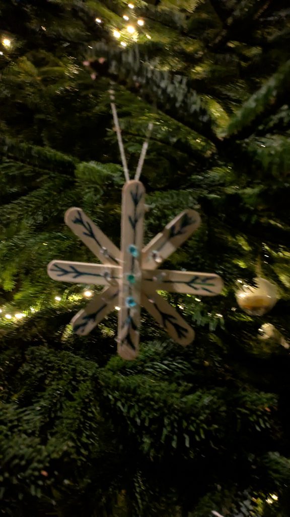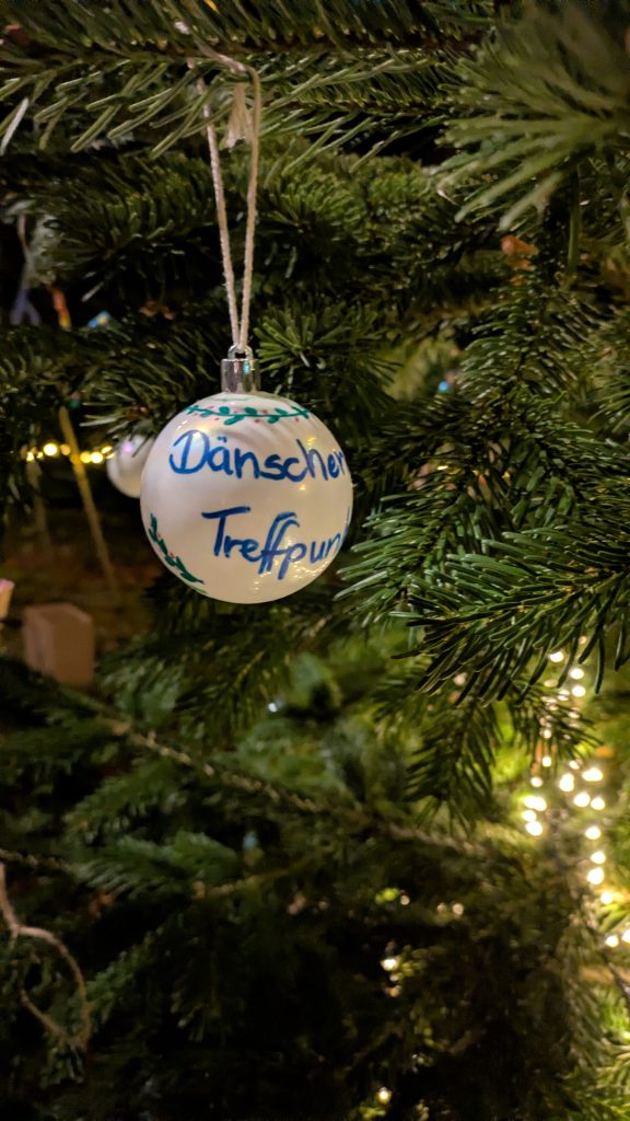 Gegen 17:00 Uhr machte sich die Gruppe auf den Weg zur Bushaltestelle, wo der Tannenbaum schon darauf wartete, festlich geschmückt zu werden. Bei heißem Kakao, wärmenden Apfelsaft und leckerem Kuchen wurden die gebastelten Schmuckstücke gemeinsam an den Baum gehängt und ließ ihn Stück für Stück erstrahlen.