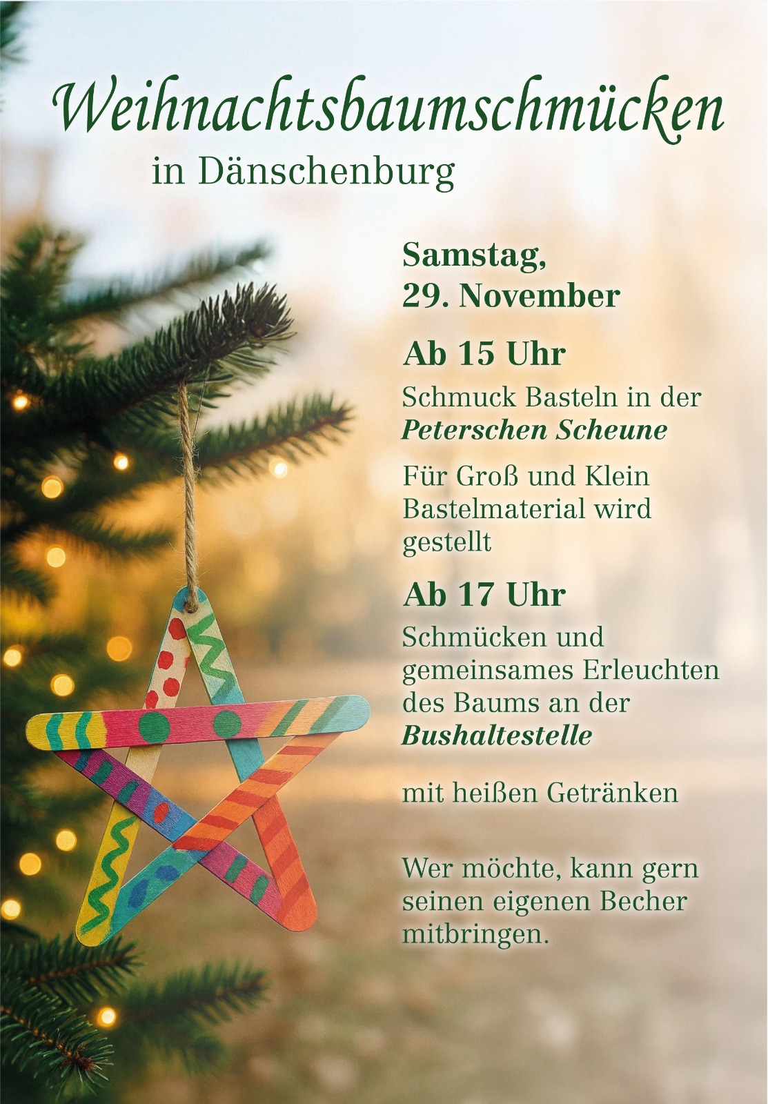 Am Samstag, 29.11.2025, möchten wir ab 15:00 Uhr mit Euch in der Peterschen Scheune Baumschmuck basteln. Das Bastelmaterial für Groß und Klein wird gestellt.