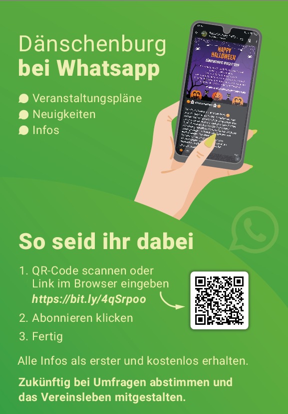 Tretet unserem WhatsApp Kanal bei und seid immer als Erstes informiert, wenn es Neuigkeiten in und um Dänschenburg gibt. Zukünftig wird es auch Umfragen geben an denen ihr teilnehmen und das Vereinsleben mitgestalten könnt.
